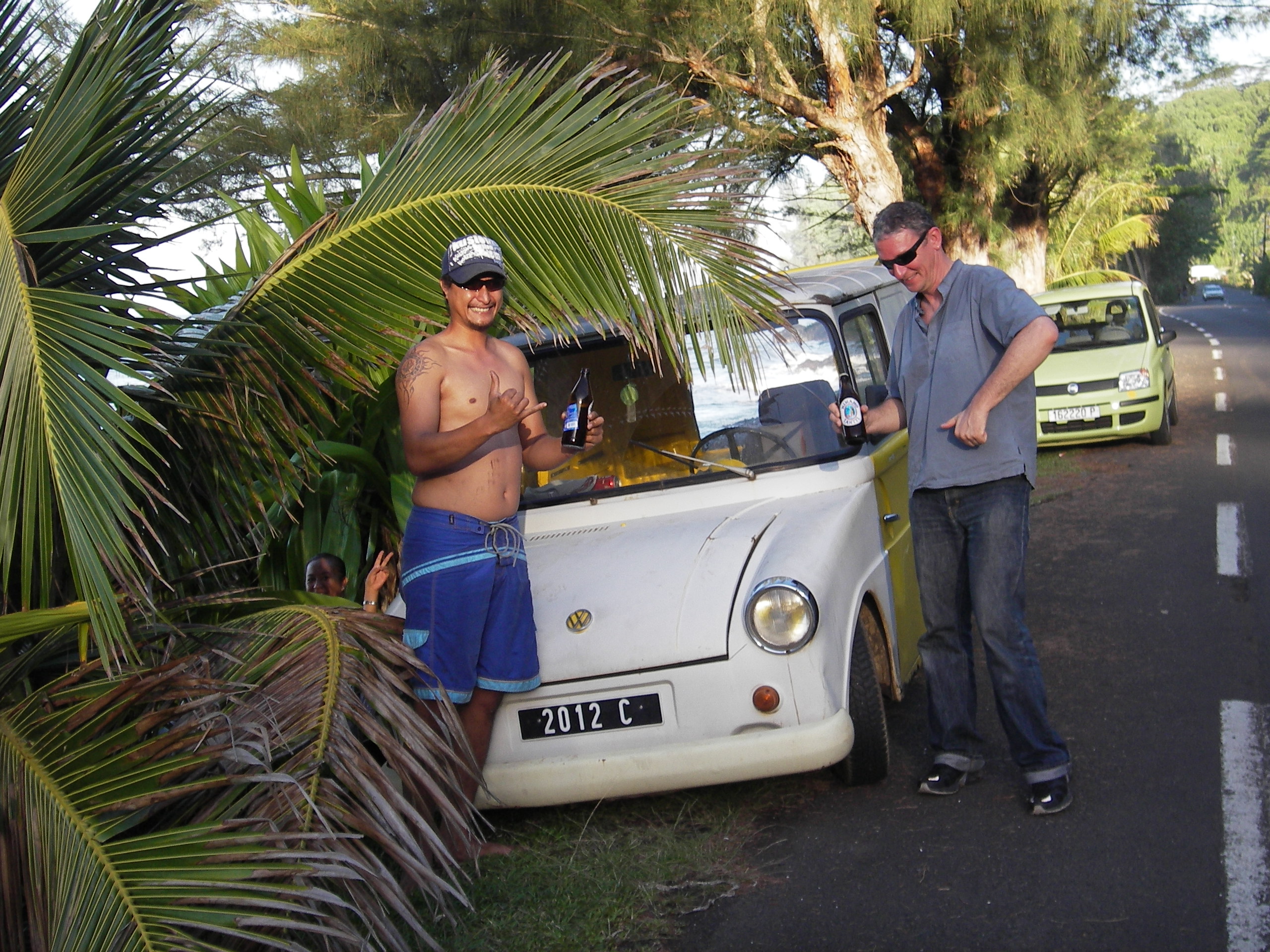"Tahiti Fridolin, mit seinem Besitzer (links) und Martin, einem langjährigen Fridolin-Fahrer aus Bremen, der hier nun so ziemlich als letztes auf der Welt einen Fridolin erwartet hätte.