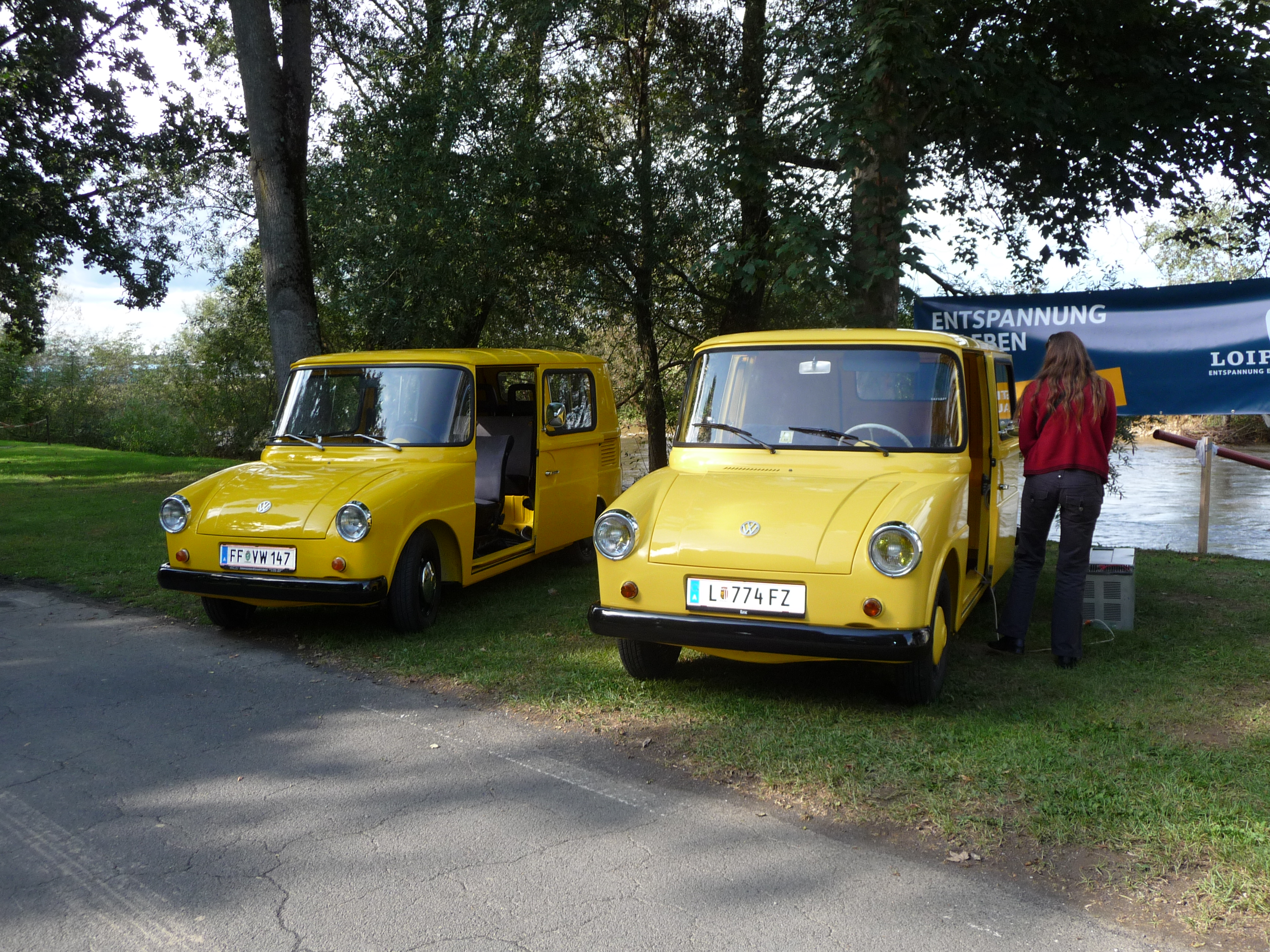 "Hier die beiden einzigen zum Verkehr zugelassenen Fahrzeuge in Österreich. Beide sind gerade fertigrestauriert und beim 13. int. Käfertreffen in Fürstenfeld am 6. Sept. 2009 erstmals präsentiert worden. Das linke Fahrzeug ist das "Clubfahrzeug" des Käferclub Fürstenfeld, das Fahrzeug rechts stammt aus Linz und hat für dieses Zusammentreffen 300 km (in eine Richtung) zurückgelegt und das sogar mit Wohnanhänger. Die beiden Fz. wurden weitestgehend original wiederhergestellt, das Clubfahrzeug ist allerdings für 4 Personen zugelassen und hat zwei Schiebefenster im hinteren Bereich."